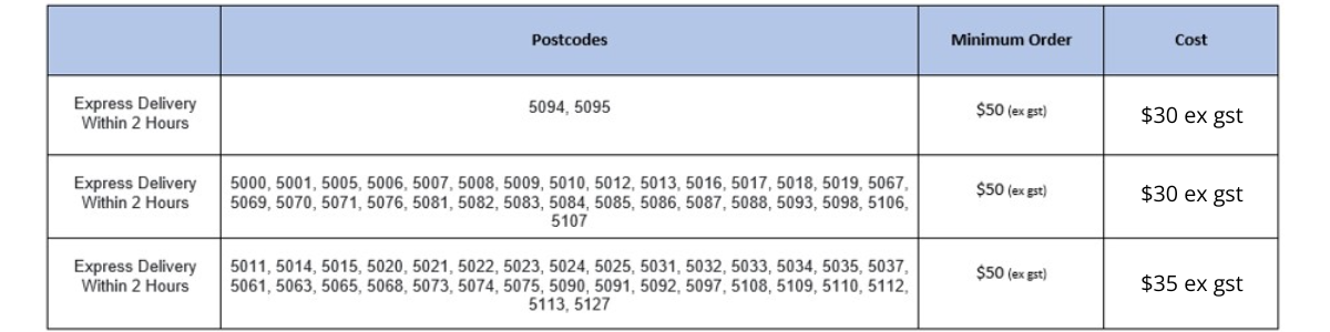 Express delivery applies to postcode 5000, 5001, 5005, 5006, 5007, 5008, 5009, 5010, 5011, 5012, 5013, 5014, 5015, 5016, 5017, 5018, 5019, 5020, 5021, 5022, 5023, 5024, 5025, 5031, 5032, 5033, 5034, 5035, 5037, 5061, 5063, 5065, 5067, 5068, 5069, 5070, 5071, 5073, 5074, 5075, 5076, 5081, 5082, 5083, 5084, 5085, 5086, 5087, 5090, 5091, 5092, 5093, 5094, 5095, 5096, 5097, 5098, 5106, 5107, 5108, 5109, 5110, 5112, 5113, 5127